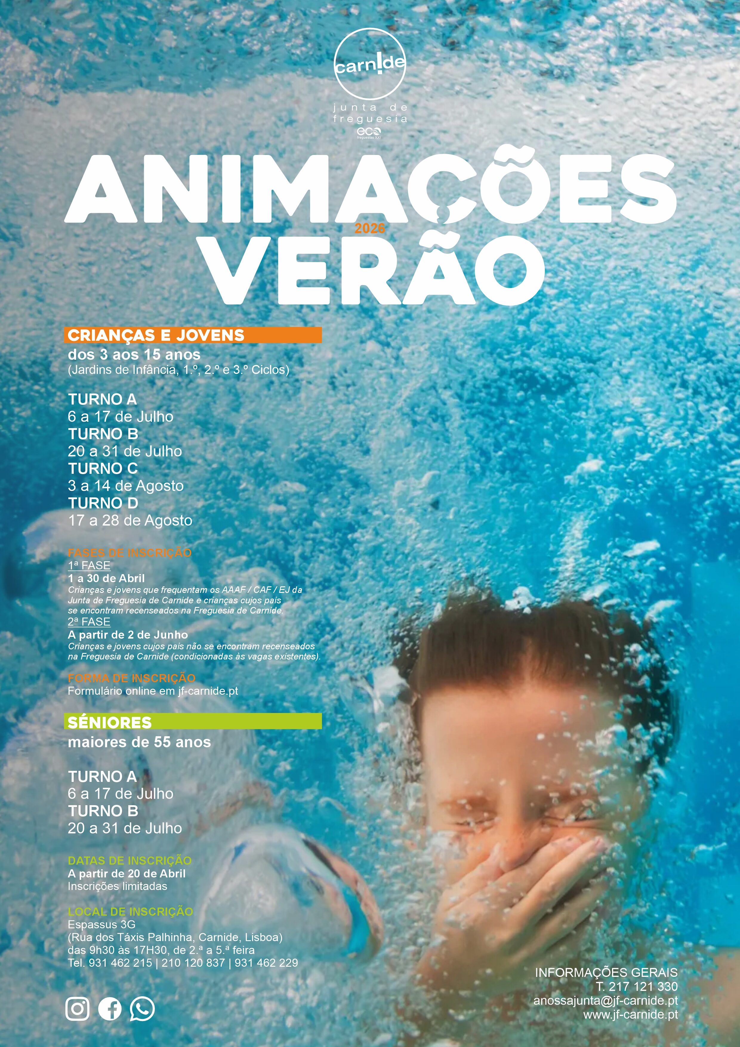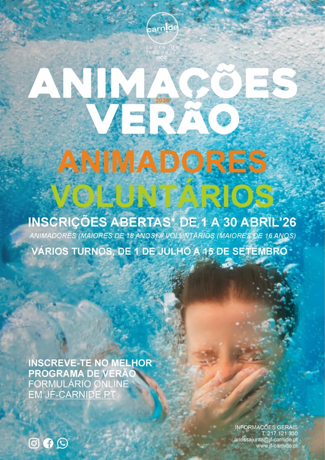 Formulário Animadores & Voluntários ↗As Animações de Verão constituem uma iniciativa da Junta de Freguesia de Carnide com carácter educativo, cultural, desportivo e recreativo, procurando proporcionar férias diversificadas, acompanhadas e adequadas às necessidades das famílias.